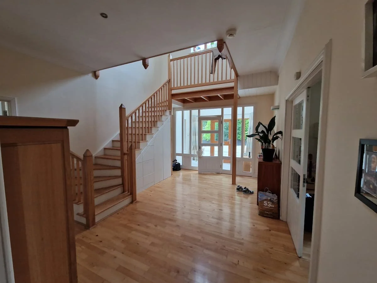 The entry hall was separated by an indoor porch area which ultimatey blocked light into the main hall area. This, along with the mass of knotted pine provided anything but the wow factor!