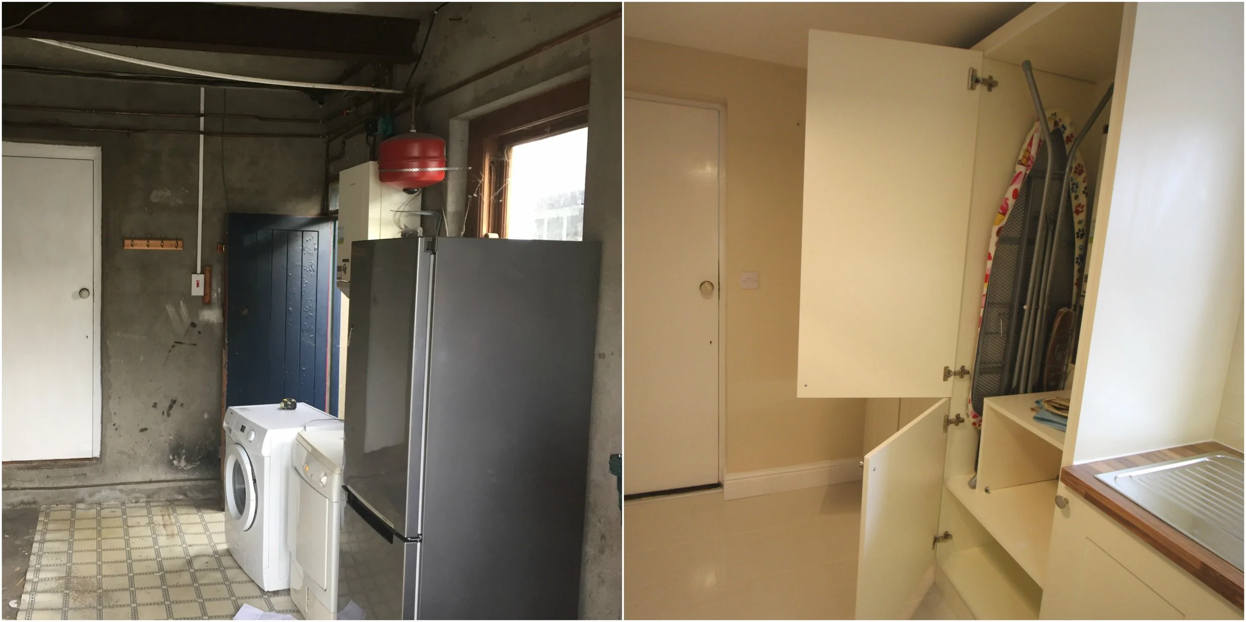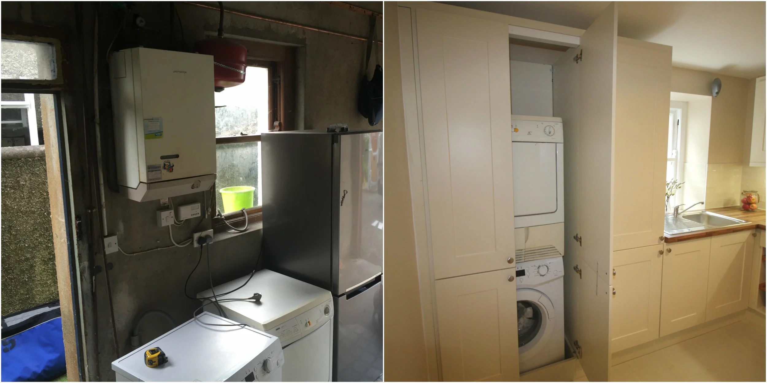 Housing the tumble and washing machine was an absolute must and the tall narrow cabinet which housed the boiler doubled up as a great storage cupboard for the ironing board, iron, mops and detergents.