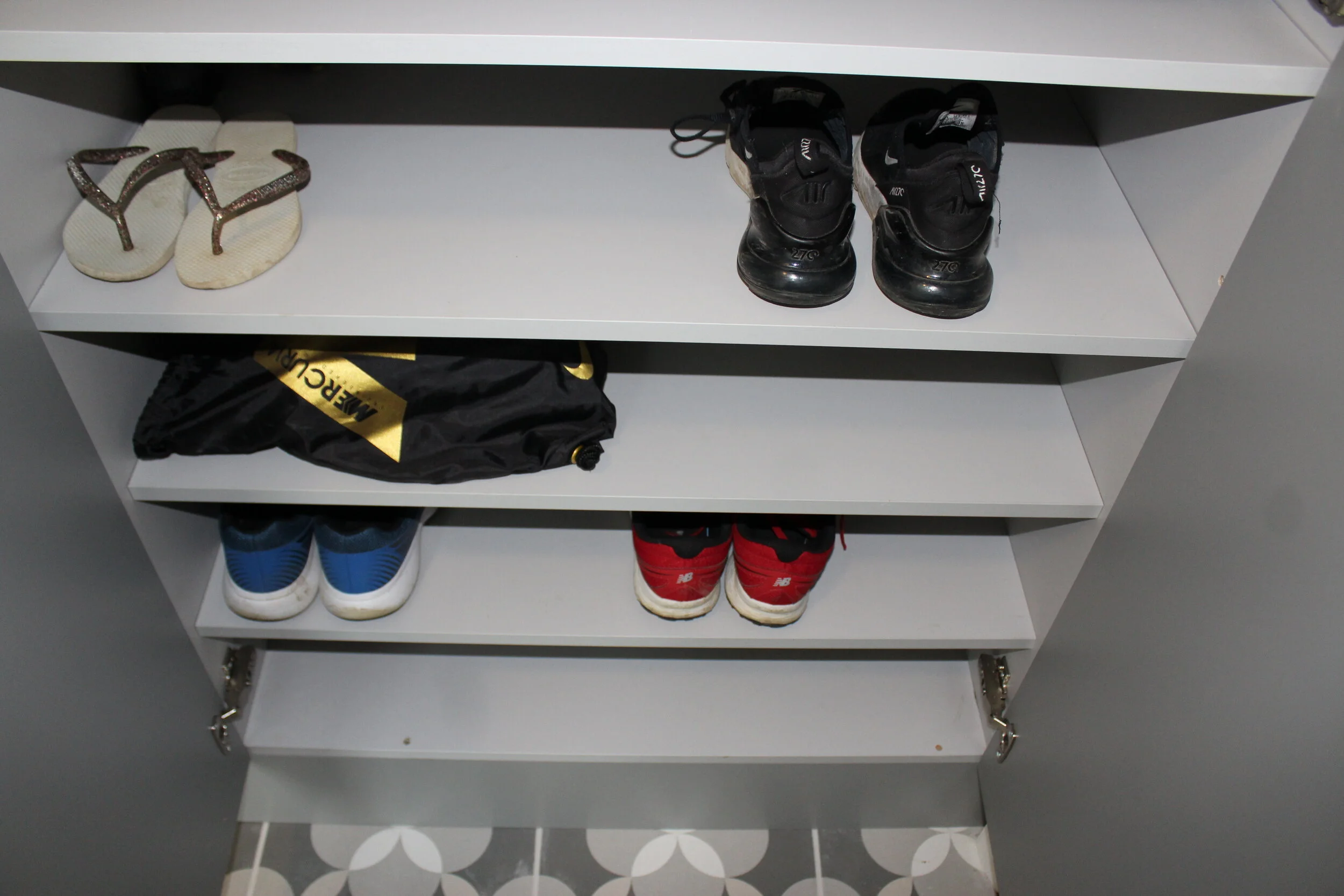 The dreaded shoes, boots and a tsunami of trainers were not going to come between me and our idyllic style utility. So, in the space below the “ironing basket” shelf, we incorporated ample shoe storage, all hidden away of course behind closed doors.