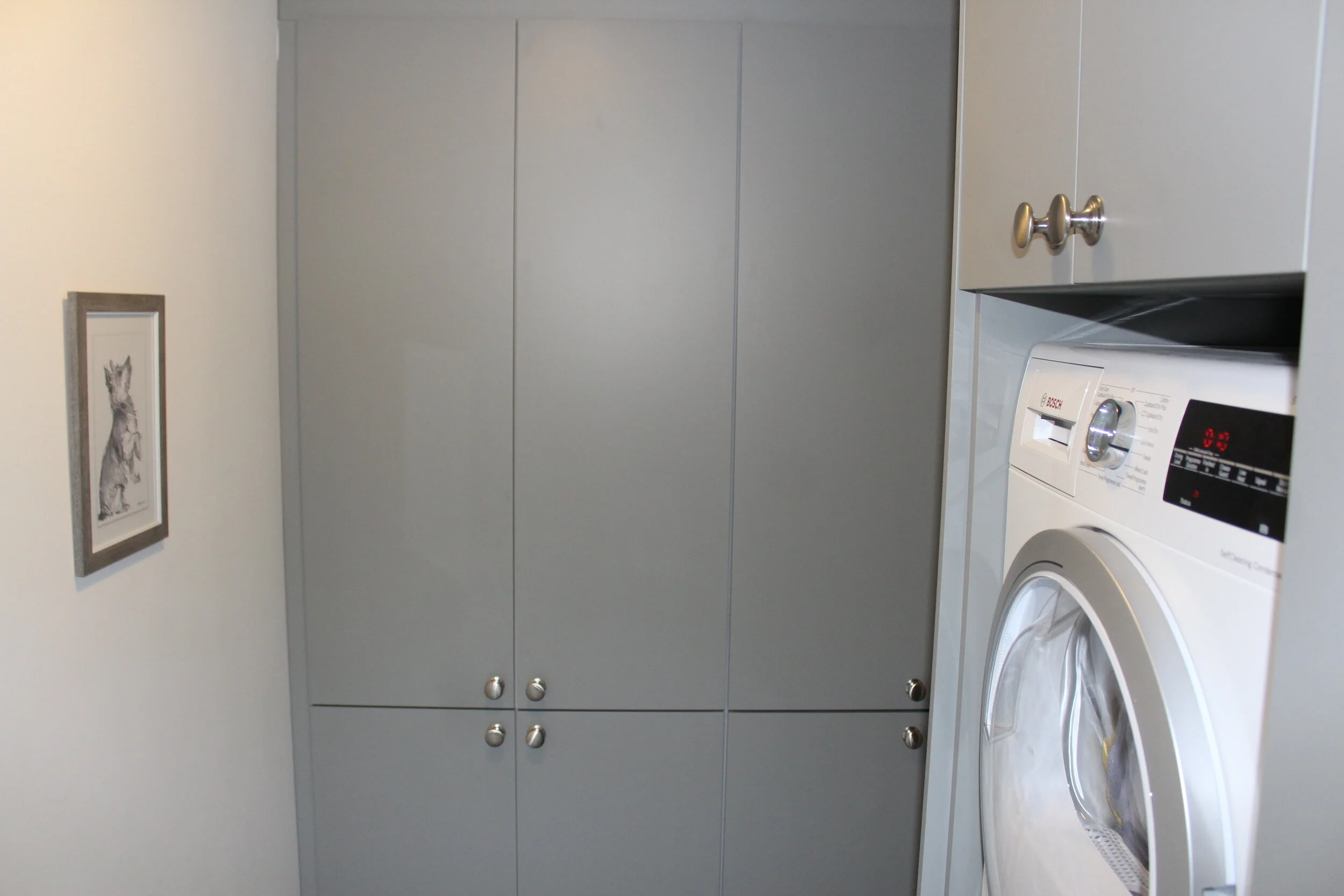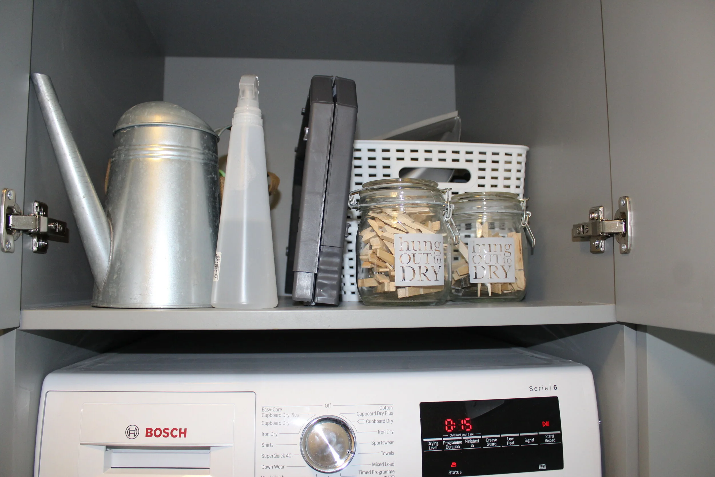 As we went with full height units, we were able to place double doors above the dryer for storage. Here we store clothes pegs, drying hangers, and all that is required for our large house plant family.