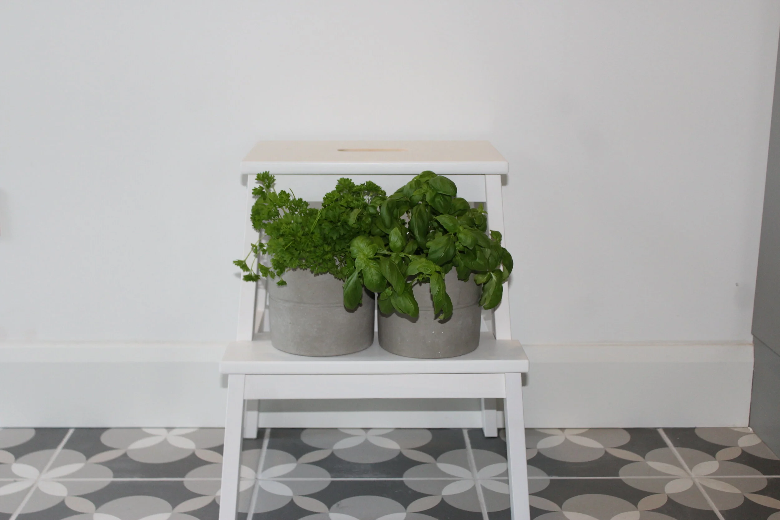 A small white step ladder from Ikea is perfect for reaching the top units but also acts as the perfect location to plant the laundry basket when filling or emptying the washer or dryer (or to facilitate this little photo shoot, in holding our potted herbs).