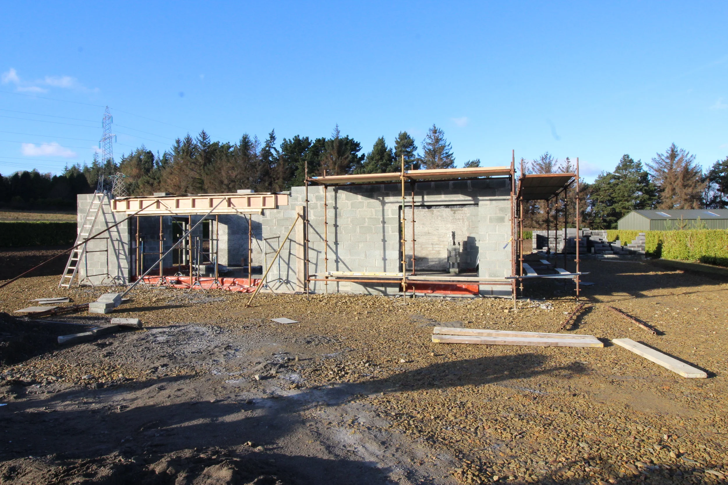 While waiting for the steel framework to be fabricated for our upper level, we pushed on with some rendering on all exterior blockwork in preparation for our cedar cladding. We then continued with applying scratch work on all the interior walls.