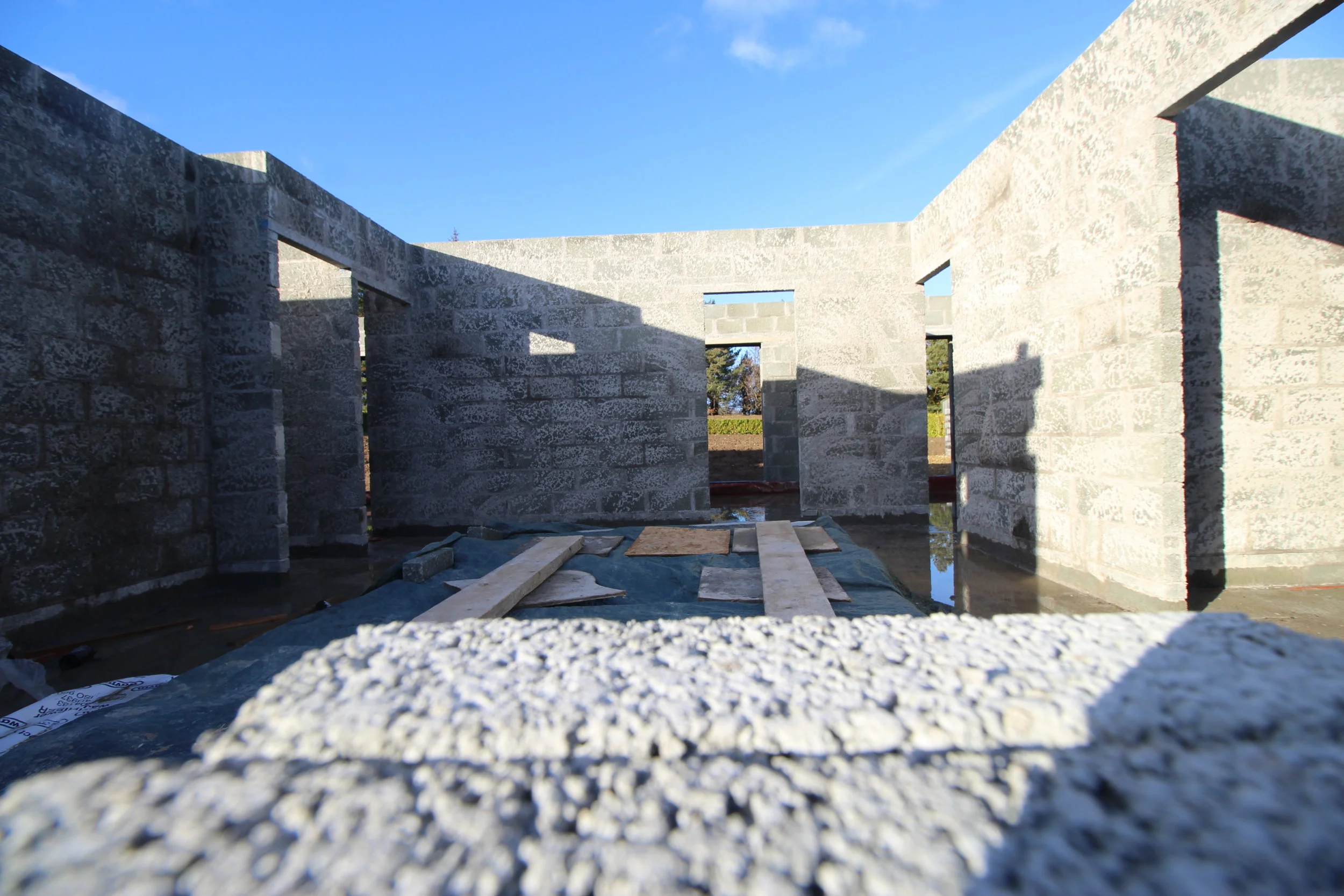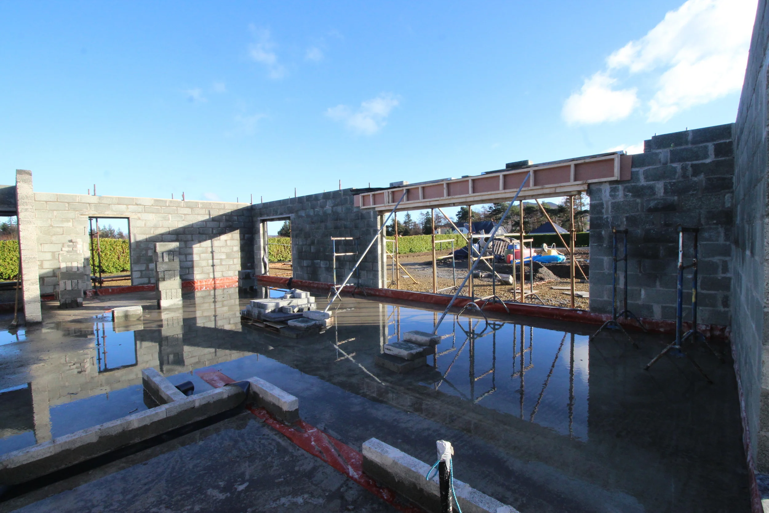 Since the external block work was completed, we moved onto the interior walls getting them up to joist level. We then had the tedious task of casting a concrete structure over our fabulous opening in our open-plan kitchen/dining/living area. After setting up the shuttering formwork and inserting a steel structure within, we finally filled it with concrete allowing it to cure for 30 days. This process will be so worthwhile (easy for me to say, since I didn’t lift as much of finger on it), but the light and views will be priceless.