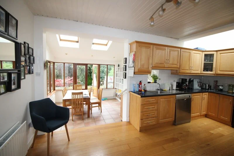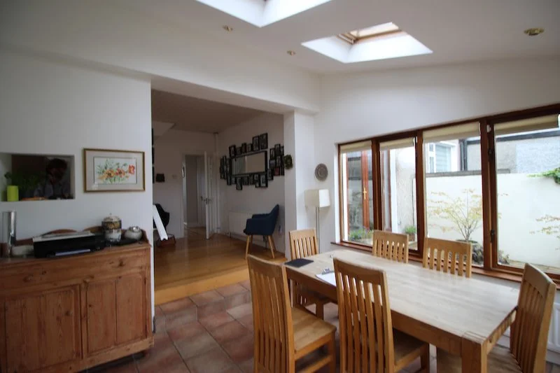 This lovely family home extended their home many years ago as they the just need additional dining space and a new shower room and utility. At the time the new extension gave them just that, however, this resulted in their kitchen being buried in the centre of their home with no real connection to garden or the utility space. Our customer reached out to us to see if we could reconfigure this entire footprint, so that it would work better on every level. We did just that. We removed the existing shower room and utility and relocated a new kitchen to the rear. We re-arrange the existing roof windows and introduced a new one to unify this space. We then introduced a new shower room and utility in the old kitchen area. We maximised the use of space and created a storage new wall where you now enter the utility and shower room and a new window seat with storage at their new designated dining area. The one engineered floor board want installed in the main open plan and transitional hall to give it a cohesive feel.